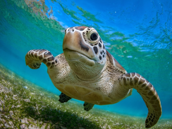 The green turtle (Chelonia mydas) is the most frequently seen turtle in Zanzibar. Large, calm, and mostly herbivorous, they graze on seagrass and algae. This feeding method prevents overgrowth and helps maintain productive seagrass ecosystems. Green turtles are commonly spotted at sanctuaries in Nungwi and in the wild around Mnemba Atoll.
